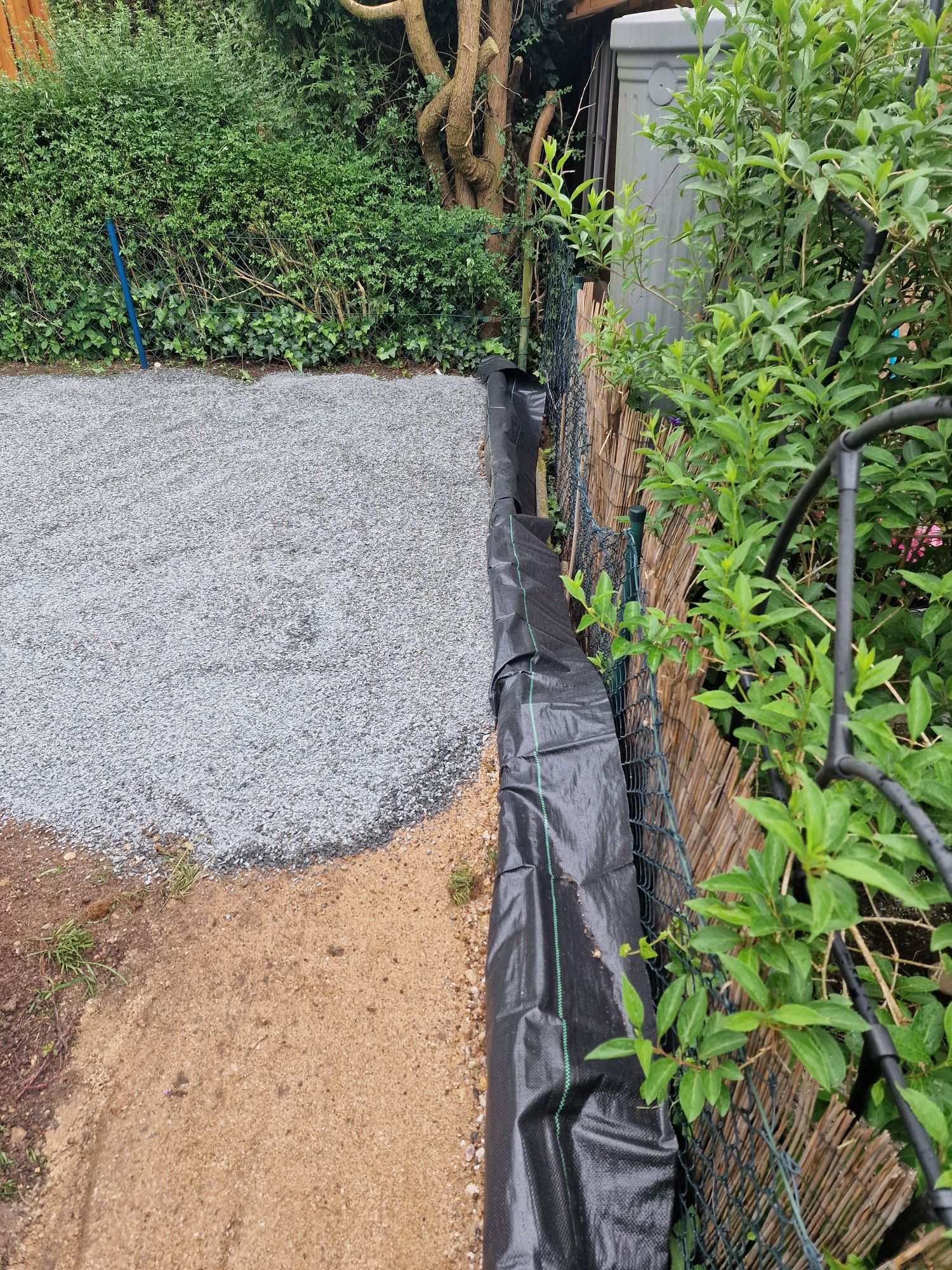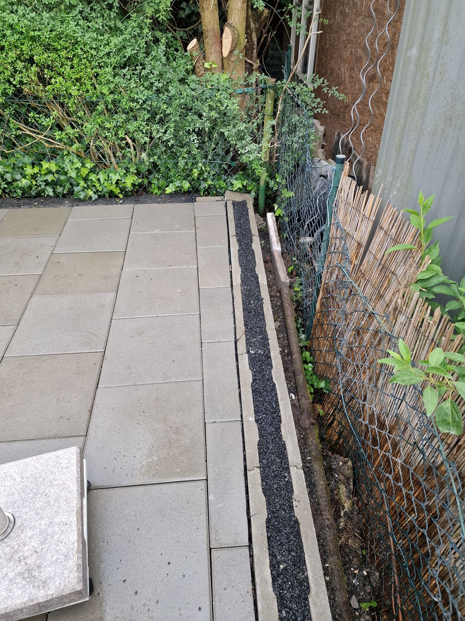 Zu Beginn wurde der Altbestand abgetragen und entsorgt, teilweise konnten wir aber auch die Betonplatten des Kunden wiederverwenden. Danach wurden Vorbereitungen für die kleine Stützmauer getroffen und im Anschluss dann erbaut. Boden verdichten war hier auch angesagt, durch eine große Konifere die bereits letztes Jahr entfernt worden war, war der Boden sehr humusreich, durch Zugabe durch Schotter wurde dieser verfestigt (wir haben hier nicht alle DIN Normen erfüllt, Aufgrund der Lage des Gartens - Kunden wussten Bescheid). Auf einem neuem Splittbett wurden dann sowohl die alten, als auch neue Betonterrassenplatten (40*40*5) verlegt und an den Seiten angepasst und verfugt. Das schönste kam dann zum Schluss, wir konnten ca. 11m2 Rollrasen (aus der Region) neben der neuen Terrasse verlegen, damit der Kunde sofort ein WOW Effekt hat!